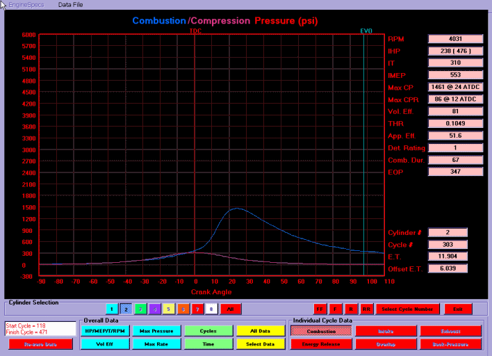 The data below represents only a small sample of the various data graphs produced after each run down the dragstrip. The software generates graphs summarizing the overall run in terms of HP, torque, combustion pressure, location of peak combustion pressure relative to TDC, volumetric efficiency etc. The software also generates graphs for each and every combustion and non combustion cycle during the run, displaying pressure vs. crank angle, air/fuel burn rates vs. crank angle and numerical data such as HP for each combustion cycle, peak combustion pressure/location, amount of energy released and how efficiently it was applied, etc.