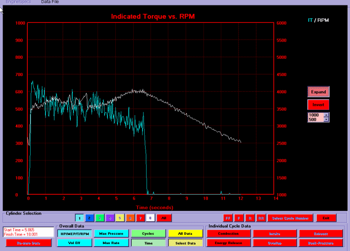Engine torque for cylinder 1 is indicated by the blue line and engine rpm by the white line. Engine torque for cylinder 1 (blue line) starts off high at the beginning of the run near 600 ft.lb. then deteriorates throughout the run to a mere 400 ft.lb. as the combustion process is not properly stabilized. A substantial amount of cycle to cycle variation in the combustion process results in the torque for cylinder 1 varying by +/-10 % from cycle to cycle in addition to deterioration of the combustion process with time.