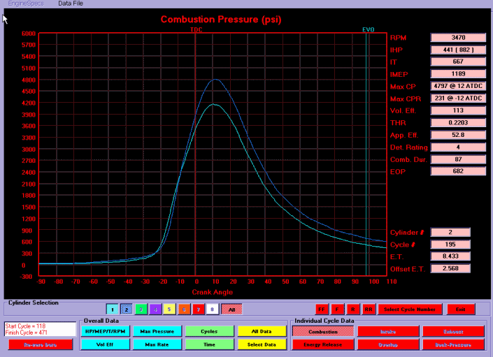 The combustion pressure graphs of Cycle 195 (2.568 seconds into the run) are shown for the first instrumented cylinder (light blue line) and the second instrumented cylinder (dark blue line). On this cycle the second cylinder develops substantially more peak pressure and pressure on the power stroke than the first cylinder. This is a good combustion cycle for the second cylinder and on this cycle 667 ft.lb. of torque was developed by this cylinder. Unfortunately the combustion process in the second cylinder was unstable and the number of good combustion cycles during the run were minimal.