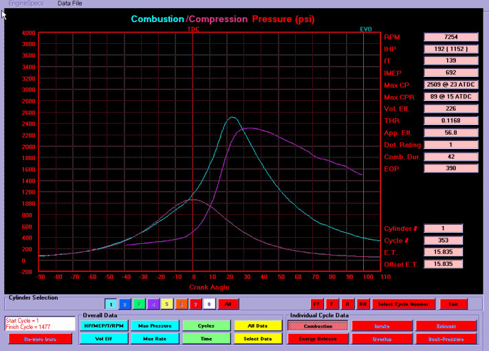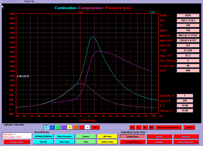 The data below represents only a small sample of the various data graphs produced after each dyno test. The software generates graphs summarizing the overall test in terms of HP, torque, combustion pressure, location of peak combustion pressure relative to TDC, volumetric efficiency etc. The software also generates graphs for each and every combustion and non combustion cycle during the test, displaying pressure vs. crank angle, air/fuel burn rates vs. crank angle and numerical data such as HP for each combustion cycle, peak combustion pressure/location, amount of energy released and how efficiently it was applied, etc.