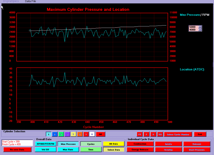 The lower graph indicates where peak combustion pressure occurred relative to TDC for each combustion cycle. The location of peak combustion pressure fluctuates substantially from cycle to cycle caused by the unstable combustion process. Engine adjustments leading to a more stable combustion process will generate more power with less stress on the engine. Well built engines would be stabilized at the high combustion pressures thereby generating more power per psi of boost.